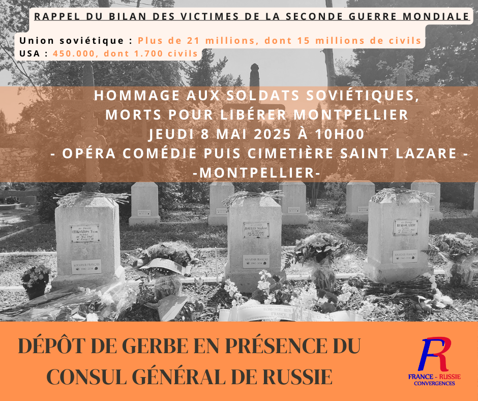 Comme les années passées, nous vous convions à nous rejoindre au dépôt de gerbe que présidera le Consul Général de Russie, à Montpellier le 𝟖 𝐦𝐚𝐢 𝐩𝐫𝐨𝐜𝐡𝐚𝐢𝐧 𝐚̀ 𝟏𝟎𝐡𝟎𝟎, en hommage aux soldats soviétiques morts sur le sol français en défendant notre belle région aux côtés de la Résistance Française.
